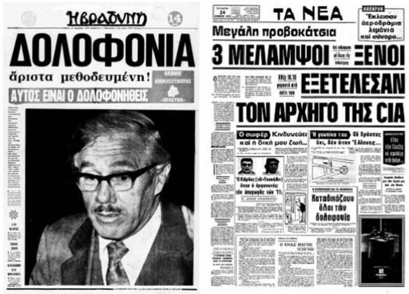 Στις 24 Δεκεμβρίου 1975, η εφημερίδα “Τα Νέα” κυκλοφόρησαν με πρωτοσέλιδο “Μεγάλη προβοκάτσια, τρεις μελαψοί ξένοι, σύμφωνα με όλες τις ενδείξεις, εξετέλεσαν τον αρχηγό της CIA”.