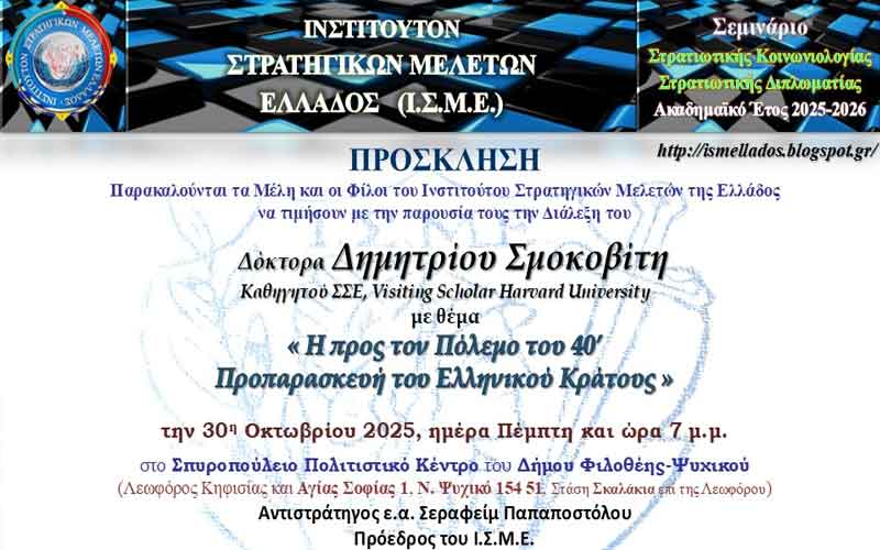 Παρακαλούνται τα Μέλη και οι Φίλοι του Ινστιτούτου Στρατηγικών Μελετών της Ελλάδοςνα τιμήσουν με την παρουσία τους την Διάλεξη του Δόκτορα Δημητρίου Σμοκοβίτη Καθηγητού ΣΣΕ, Visiting Scholar Harvard University με θέμα «Η προς τον Πόλεμο του ’40 Προπαρασκευή του Ελληνικού Κράτους» την 30η Οκτωβρίου 2025, ημέρα Πέμπτη και ώρα 7 μ.μ. στο Σπυροπούλειο Πολιτιστικό Κέντρο του Δήμου Φιλοθέης-Ψυχικού(Λεωφόρος Κηφισιάς και Αγίας Σοφίας 1, Ν. Ψυχικό 154 51, Στάση Σκαλάκια επί της Λεωφόρου)