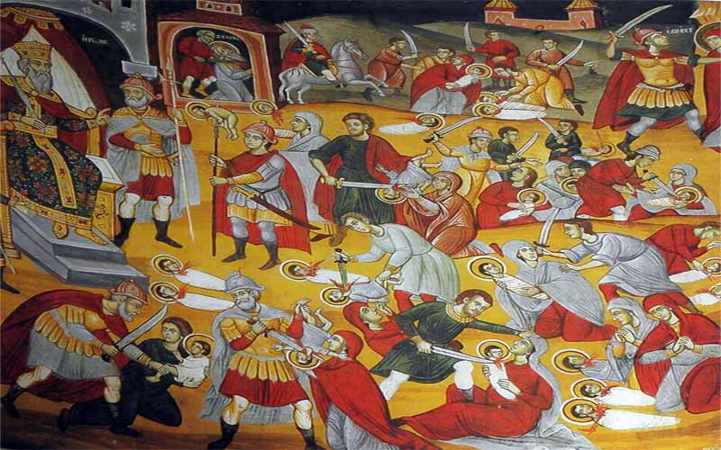 Όταν οι Μάγοι δεν επέστρεψαν στον Ηρώδη να του πουν που είναι ο Χριστός, ο πονηρός αυτός βασιλιάς μηχανεύθηκε άλλο σχέδιο για να εξοντώσει το Θείο Βρέφος. Είχε ακούσει ότι, σύμφωνα με τις Γραφές, τόπος γέννησης του Χριστού θα ήταν η Βηθλεέμ. Επειδή όμως δε γνώριζε ποιος ήταν ο Ιησούς αν βρισκόταν μέσα στη Βηθλεέμ ή στα περίχωρα της και επειδή συμπέρανε ότι το παιδί θα ήταν κάτω από δύο χρονών, έδωσε διαταγή να σφαγούν όλα τα παιδιά της Βηθλεέμ και των περιχώρων της, μέχρι της ηλικίας των δύο ετών. Η σφαγή έγινε ξαφνικά, ώστε να μη μπορέσουν οι οικογένειες να απομακρυνθούν με τα βρέφη τους. Και οι δυστυχισμένες μητέρες είδαν να σφάζονται τα παιδιά τους μέσα στις ίδιες τις αγκαλιές τους. Η χριστιανική Εκκλησία, πολύ σωστά ανακήρυξε Άγια τα σφαγιασθέντα αυτά παιδιά, διότι πέθαναν σε μια αθώα ηλικία και υπήρξαν κατά κάποιο τρόπο οι πρώτοι μάρτυρες του χριστιανισμού. Μπορεί βέβαια να μη βαπτίσθηκαν εν ύδατι, βαπτίσθηκαν όμως, μέσα στο ίδιο ευλογημένο αίμα του μαρτυρίου τους.