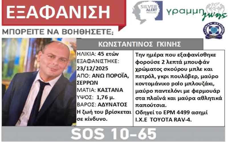 Από χθες το πρωί βρίσκεται σε εξέλιξη εκτεταμένη επιχείρηση στις Σέρρες για τον εντοπισμό του διοικητή του Πυροσβεστικού Κλιμακίου Πορροΐων, ο οποίος αγνοείται. Η εξαφάνιση του 45χρονου άντρα δηλώθηκε στο Αστυνομικό Τμήμα Πορροΐων από τη σύζυγό του, όταν διαπιστώθηκε ότι απουσίαζε από το σπίτι για περισσότερες από 24 ώρες, χωρίς να έχει εμφανιστεί ούτε στην υπηρεσία του.