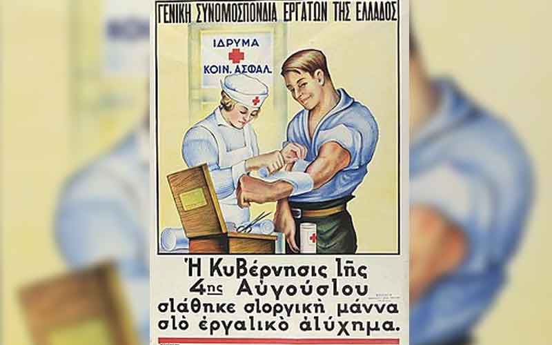 • 1937: Ξεκινά τη λειτουργία του το Ι.Κ.Α., (Ίδρυμα Κοινωνικών Ασφαλίσεων). Ο Ιωάννης Μεταξάς, Πρόεδρος της τότε Εθνικής Κυβερνήσεως του καθεστώτος της 4ης Αυγούστου είπε: «Ο εργατικός κόσμος …{…}… θα εύρη τον στοργικόν προστάτην όταν αρρωστήσει αυτός και τα παιδιά του ή η γυναίκα του, τον πρόθυμον χορηγητήν όταν πάθει ατύχημα στη δουλειά του, θα εύρη περίθαλψιν εις τα γεράματά του, ….».
