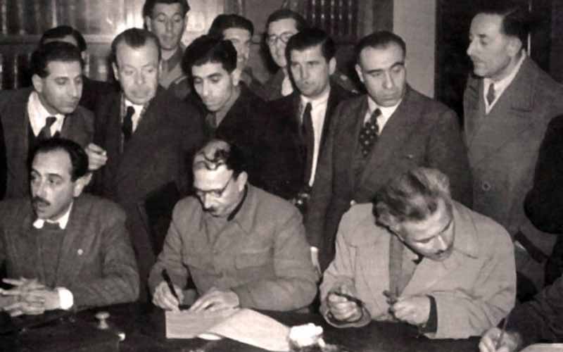 • 1945: Υπογράφεται η Συνθήκη της Βάρκιζας, με την οποία οι κομμουνιστοσυμμορίτες του ΕΑΜ παραδίδουν τα όπλα τους.