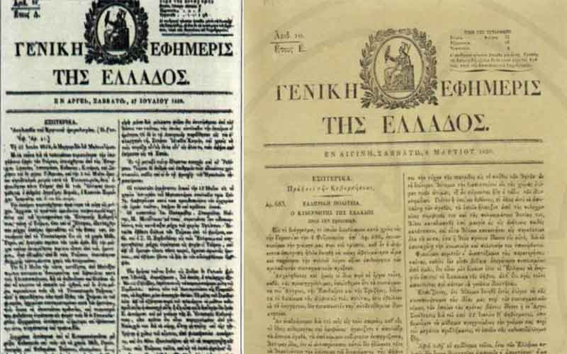 • 1825: Εκδίδεται το πρώτο φύλλο της Γενικής Εφημερίδος της Ελλάδος, προδρόμου της Εφημερίδας της Κυβερνήσεως. Διευθυντής της ο Θεόκλητος Φαρμακίδης.