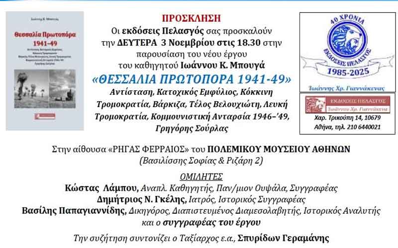 Οι εκδόσεις Πελασγός σας προσκαλούν την Δευτέρα 3 Νοεμβρίου στις 18.30 στην παρουσίαση του νέου έργου του καθηγητού Ιωάννου Κ. Μπουγά «ΘΕΣΣΑΛΙΑ ΠΡΩΤΟΠΟΡΑ 1941-49» Αντίσταση, Κατοχικός Εμφύλιος, Κόκκινη Τρομοκρατία, Βάρκιζα, Τέλος Βελουχιώτη, Λευκή Τρομοκρατία, Κομμουνιστική Ανταρσία 1946-’49, Γρηγόρης Σούλας, στην αίθουσα «ΡΗΓΑΣ ΦΕΡΡΑΙΟΣ» του Πολεμικού Μουσείου Αθηνών (Βασιλίσσης Σοφίας & Ριζάρη 2)