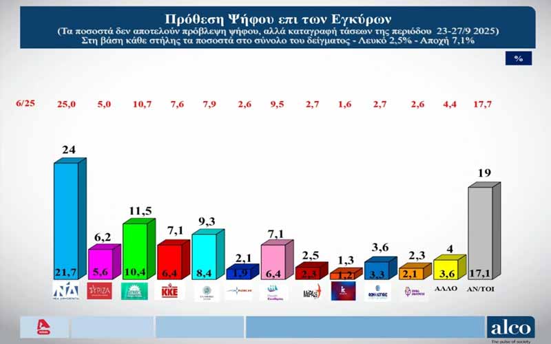 Παρ’ όλα αυτά η ΝΔ καταγράφει ποσοστό 24% (25% τον Ιούνιο) διπλάσιο από το ΠΑΣΟΚ του ταλαίπωρου Ανδρουλάκη με 11,5% (10,7%).