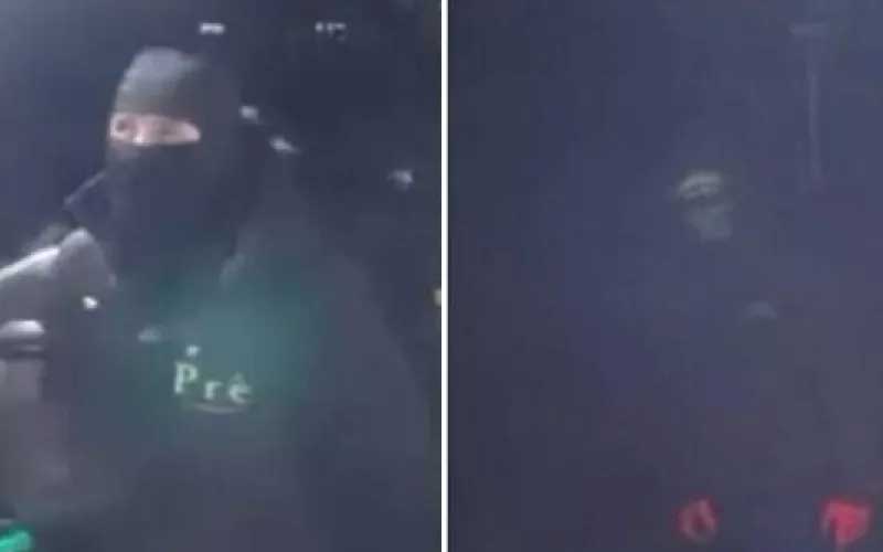 Η αστυνομία έδωσε στη δημοσιότητα πλάνα όπου διακρίνονται δύο μασκοφόροι με σκούρα ρούχα να πλησιάζουν στην είσοδο, να ρίχνουν εύφλεκτο υλικό και να βάζουν φωτιά.