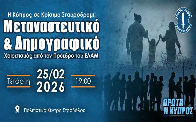 Το ΕΛΑΜ σας προσκαλεί σε εκδήλωση με θέμα, «Η Κύπρος σε Κρίσιμο Σταυροδρόμι: Μεταναστευτικό & Δημογραφικό», την Τετάρτη, 25 Φεβρουαρίου 2026, η ώρα 19:00, στο Πολιτιστικό Κέντρο Στροβόλου.