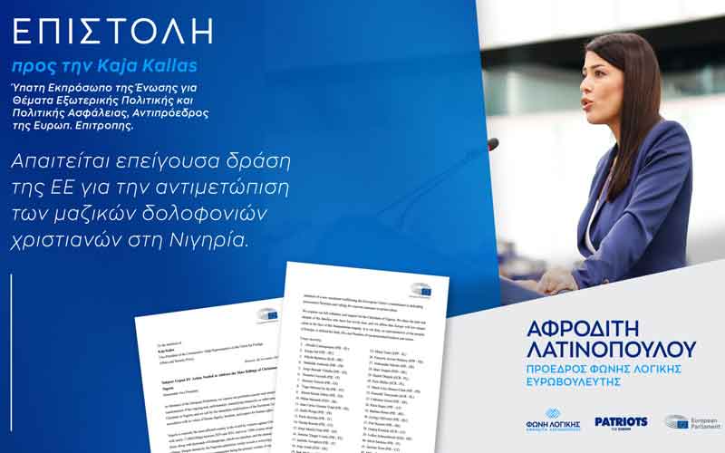 Με επιστολή που συνυπογράφουν 47 Ευρωβουλευτές από 5 πολιτικές ομάδες και 20 χώρες, που εκπροσωπούν την πλειοψηφία στο Ευρωπαϊκό Κοινοβούλιο, προς την Ύπατη Εκπρόσωπο της Ένωσης για Θέματα Εξωτερικής Πολιτικής και Πολιτικής Ασφαλείας, κα Kaja Kallas, καταγγέλλεται το ανελέητο πογκρόμ κατά των Χριστιανών στη Νιγηρία.
