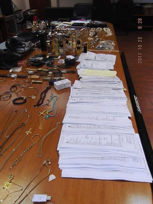 Από τις έρευνες που πραγματοποιήθηκαν, βρέθηκαν και κατασχέθηκαν ένα (1) περίστροφο, πλήθος κοσμημάτων και ασημικών, μεγάλος αριθμός ηλεκτρονικών και ηλεκτρικών συσκευών όπως τηλεοράσεις, ηλεκτρονικοί υπολογιστές, φωτογραφικές μηχανές, κινητά τηλέφωνα, αποδεικτικά εμβασμάτων στο εξωτερικό συνολικού ποσού που υπερβαίνει τις 85.000 ευρώ, δελτία αποστολής αντικειμένων και ιδιωτικά συμφωνητικά από ενεχυροδανειστήρια συνολικού ποσού που υπερβαίνει τις 27.000 ευρώ