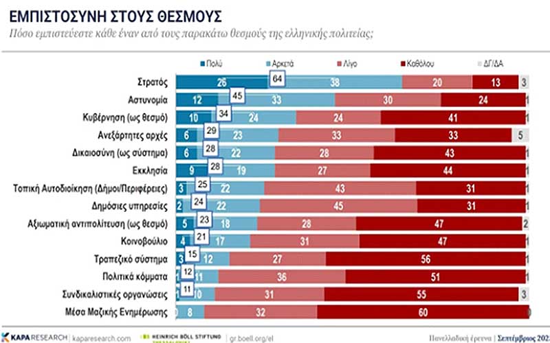 Στον αντίποδα, από όλους τους θεσμούς, μόνο ο στρατός διατηρεί ποσοστά εμπιστοσύνης άνω του 50%.
