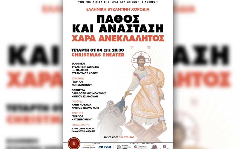 Το Christmas Theater και η Ελληνική Βυζαντινή Χορωδία διοργανώνουν μια ξεχωριστή μουσικοπνευματική εκδήλωση με τίτλο «Πάθος και Ανάσταση, Χαρά Ανεκλάλητος» υπό την αιγίδα της Ιεράς Αρχιεπισκοπής Αθηνών την Τετάρτη 1 Απριλίου 2026, στο Christmas Theater.