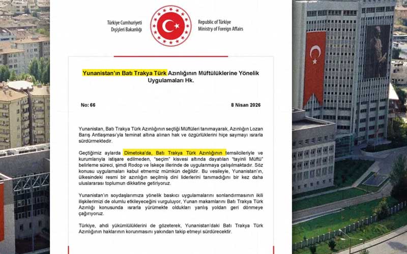 Στην ανακοίνωσή του, που δημοσιεύεται στην ιστοσελίδα fonirodopis.gr,  το Υπουργείο Εξωτερικών της Τουρκίας υποστηρίζει ότι η Ελλάδα «αγνοεί τα δικαιώματα και τις ελευθερίες» της μειονότητας, ενώ κάνει λόγο για επιβολή διαδικασιών χωρίς διαβούλευση. Την ίδια στιγμή, καλεί τη χώρα μας να «υπαναχωρήσει από τον λανθασμένο δρόμο», συνδέοντας ευθέως το ζήτημα με τη βελτίωση των διμερών σχέσεων.