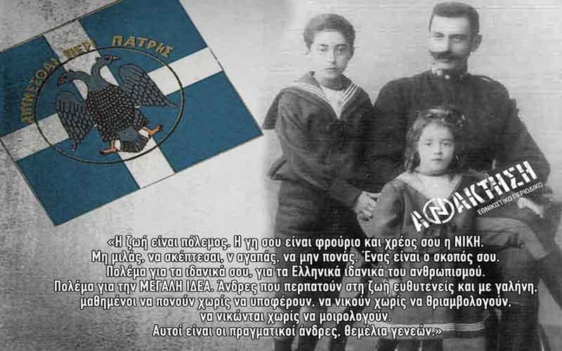 Η ζωή είναι πόλεμος. Η γη σου είναι φρούριο και χρέος σου η ΝΙΚΗ. Μη μιλάς, να σκέπτεσαι, ν αγαπάς, να μην πονάς. Ένας είναι ο σκοπός σου. Πολέμα για τα ιδανικά σου, για τα Ελληνικά ιδανικά του ανθρωπισμού. Πολέμα για την ΜΕΓΑΛΗ ΙΔΕΑ.