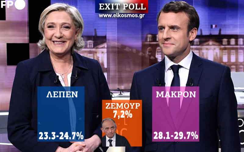 Επιβεβαιώνεται το πιο πιθανό σενάριο που προέβλεπε εύκολα ή δύσκολα επικράτηση του Εμμανουέλ Μακρόν. Τα πρώτα επίσημα exit poll για τις εκλογές στη Γαλλία, τα οποία σύμφωνα με το AFP είναι αρκετά ακριβή και το ποσοστό που συγκεντρώνει ο γάλλος πρόεδρος είναι 28,1%, ενώ η Μαρίν Λεπέν συγκεντρώνει το 23.3% και στην τρίτη θέση ο αριστερός Ζαν Λικ Μελανσόν με 20,1%.Ο Ερίκ Ζεμούρ το νέο πρόσωπο της γαλλικής μοντέρνας και λιγότερος «στιγματισμένης« δεξιάς που τόσο διαφημίστηκε συγκέντρωσε μόνο 7,2% και 5% η Βαλερί Πεκρές.
