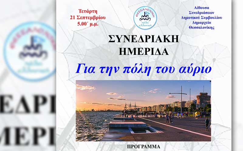Η Δημοτική Παράταξη του Δήμου Θεσσαλονίκης «Θεσσαλονίκη Πόλις Ελληνική» (επικεφαλής ο Δημοτικός Σύμβουλος Γιάννης Κουριαννίδης) διοργανώνει την Τετάρτη 21 Σεπτεμβρίου 2022 5.00´ μ.μ. στην Αίθουσα Συνεδριάσεων του Δημοτικού Συμβουλίου στο Δημαρχείο Θεσσαλονίκης συνεδριακή ημερίδα με θέμα «Για την πόλη του αύριο»