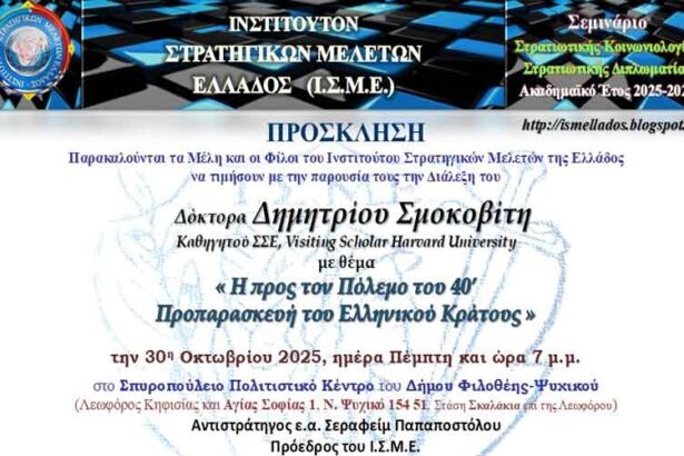 Παρακαλούνται τα Μέλη και οι Φίλοι του Ινστιτούτου Στρατηγικών Μελετών της Ελλάδοςνα τιμήσουν με την παρουσία τους την Διάλεξη του…