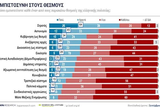 Την πλήρη κατάρρευση της εμπιστοσύνης των Ελλήνων στους θεσμούς αποκαλύπτει η δημοσκόπηση της Kapa Research για το Heinrich Boll Stiftung.…