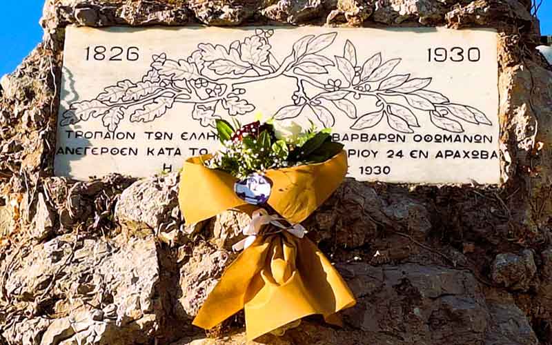 “Tρόπαιον των Eλλήνων κατά των βαρβάρων Oθωμανών, ανεγερθέν κατά το 1826 έτος, Nοεμβρίου 24 εν Aράχωβα”…