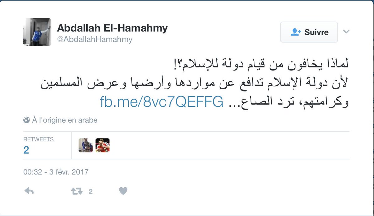 Στο λογαριασμό ονόματι Abdallah El-Hamahmy, διαβάζουμε στο dimpenews.com, δημοσιεύθηκαν πολλά tweets στην αραβική λίγα λεπτά πριν την επίθεση αναφέρει το AFP. Το 1 στις 09h31: «Στ΄’όνομα του Allah […] για τ΄αδ’έρφια μας στη Συρία και τους μαχητές σε όλον τον κόσμο ». Μετά από 1΄ ένα άλλο  tweet, αναφερόταν στη Daesh.