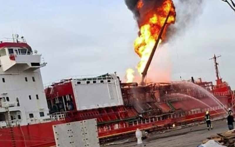 Το τουρκικό πλοίο ORINDA, φλέγεται, αγκυροβολημένο στο λιμάνι Izmail της Ουκρανίας στην περιοχή της Οδησσού.