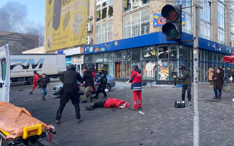 Ο Γιούρι Σομπολέφσκι, ο αντιπρόεδρος του τοπικού συμβουλίου, είπε ότι ένας πύραυλος έπεσε δίπλα σε ένα σουπερμάρκετ κοντά στην Πλατεία Ελευθερίας. «Υπήρχαν πολίτες εκεί, ζούσαν τη ζωή τους, κοίταζαν τη δουλειά τους», είπε.